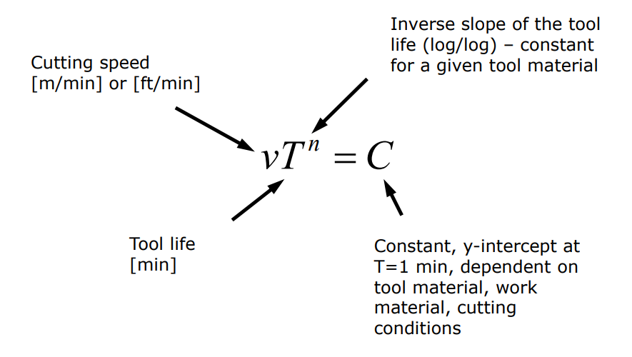 The Taylor tool life equation describes the expected tool life of a cutting tool as a function of cutting speed